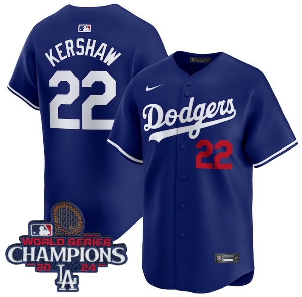 Men Nike Los Angeles Dodgers Clayton Kershaw #22 Blue Flex Base 2024 World Series Champions Stitched MLB Jersey
